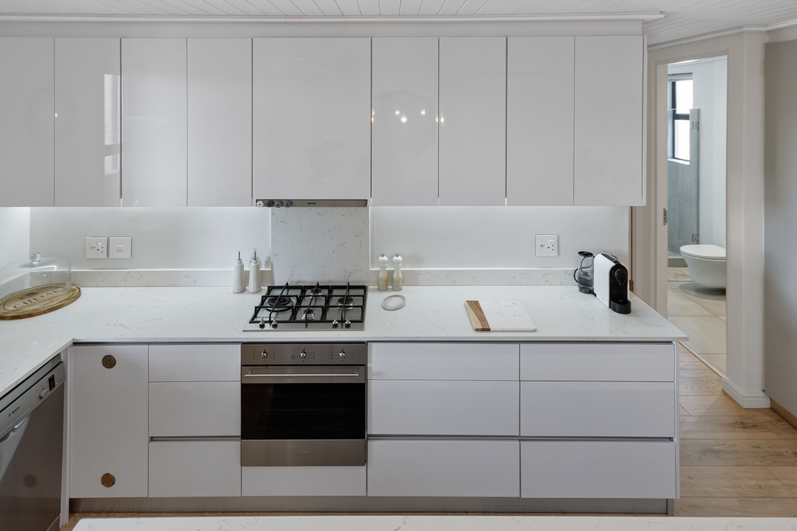 - Large spacious kitchen, with above and below counter cabinets. Crisp white, high gloss finish.