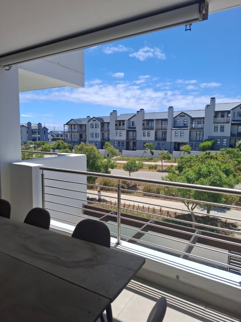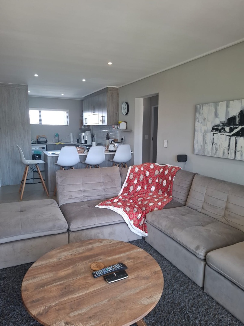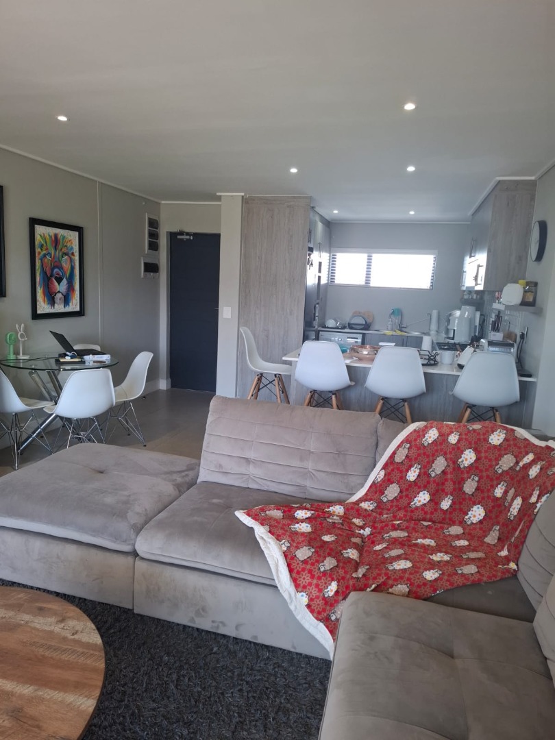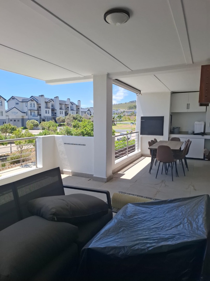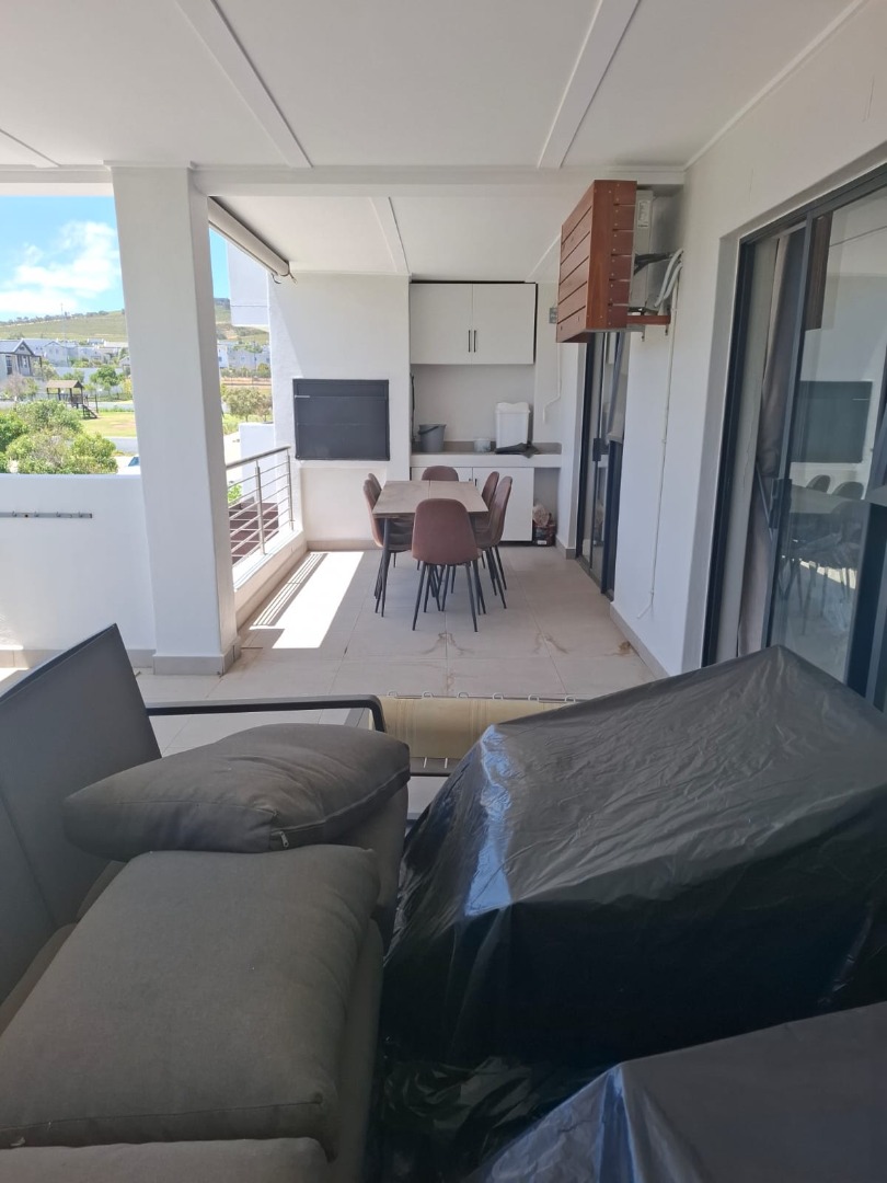 Discover modern living in this stylish 2-bedroom, 2-bathroom apartment located within the esteemed Sitari Country Estate in Somerset West. Spanning 113 sqm, this residence features an inviting open-plan layout seamlessly connecting the living, dining, and kitchen areas. The contemporary kitchen boasts an island with seating, a freestanding gas stove and extractor, light wood-look cabinetry, and sleek white countertops, complemented by recessed lighting throughout the space. Direct access from the living area leads to a generous outdoor balcony, perfect for entertaining offering space for a lounge and dining room furniture with a built in braai.