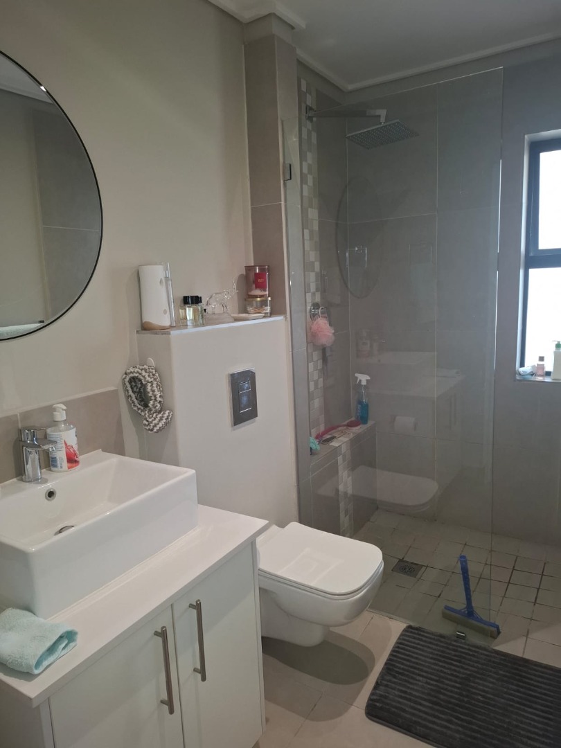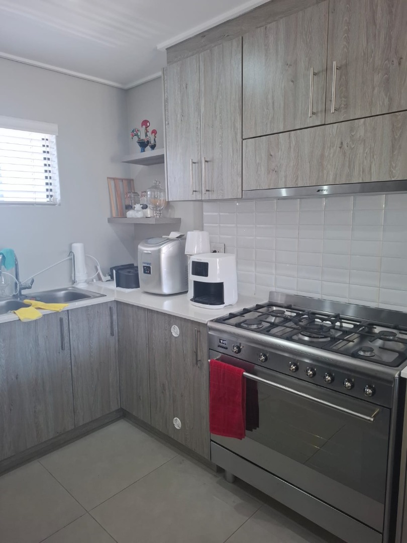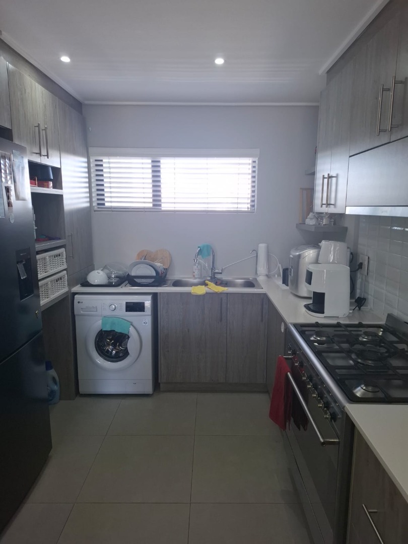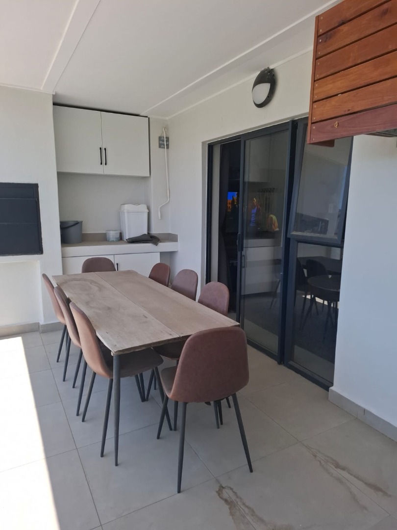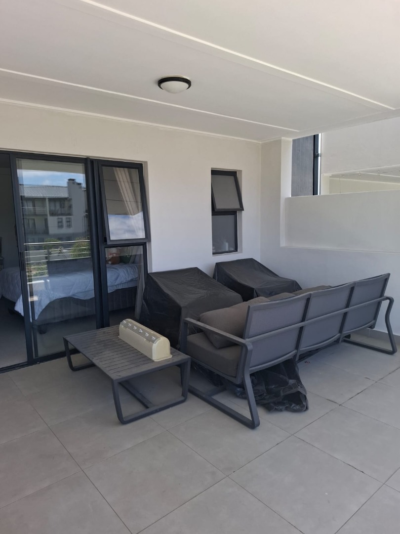 Discover modern living in this stylish 2-bedroom, 2-bathroom apartment located within the esteemed Sitari Country Estate in Somerset West. Spanning 113 sqm, this residence features an inviting open-plan layout seamlessly connecting the living, dining, and kitchen areas. The contemporary kitchen boasts an island with seating, a freestanding gas stove and extractor, light wood-look cabinetry, and sleek white countertops, complemented by recessed lighting throughout the space. Direct access from the living area leads to a generous outdoor balcony, perfect for entertaining offering space for a lounge and dining room furniture with a built in braai.