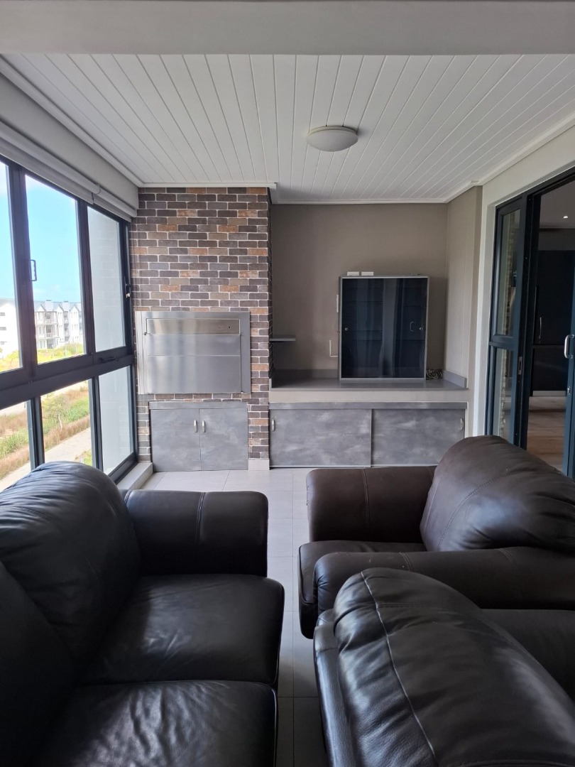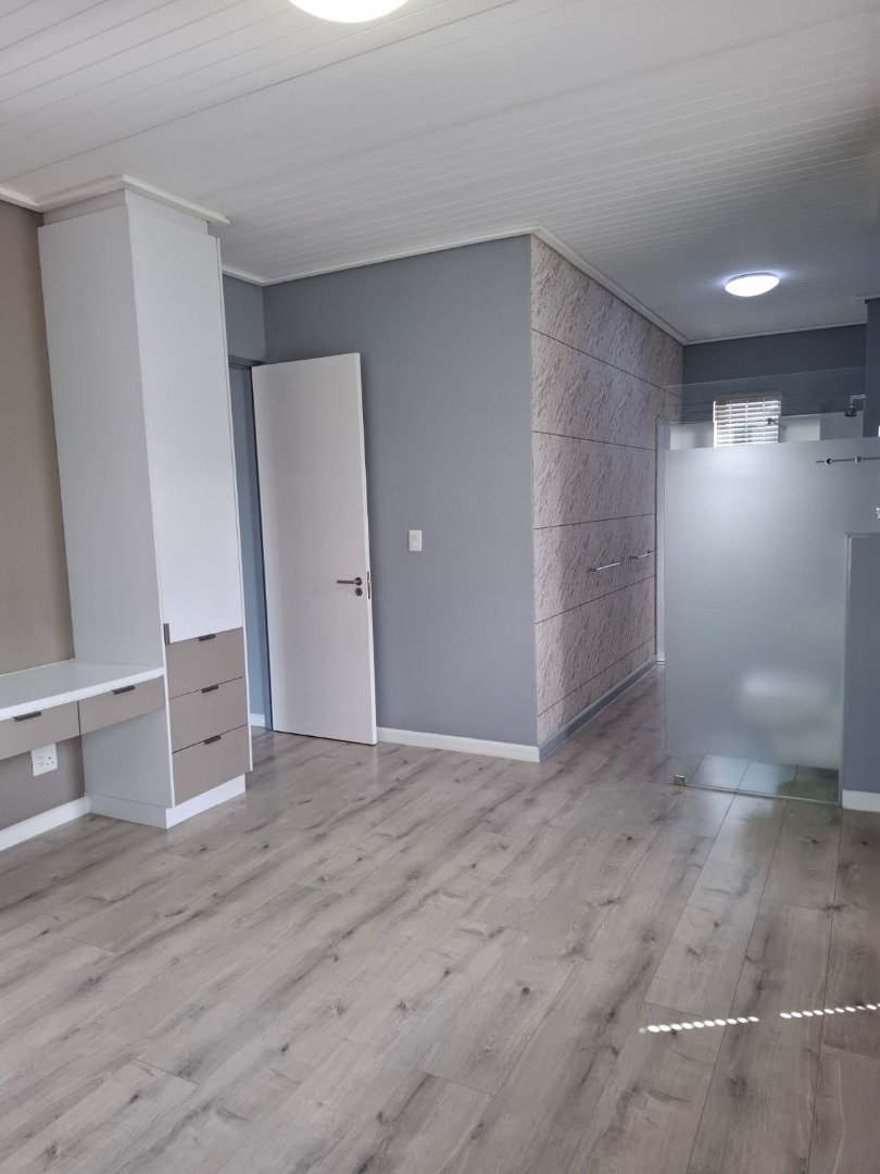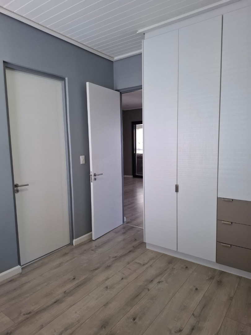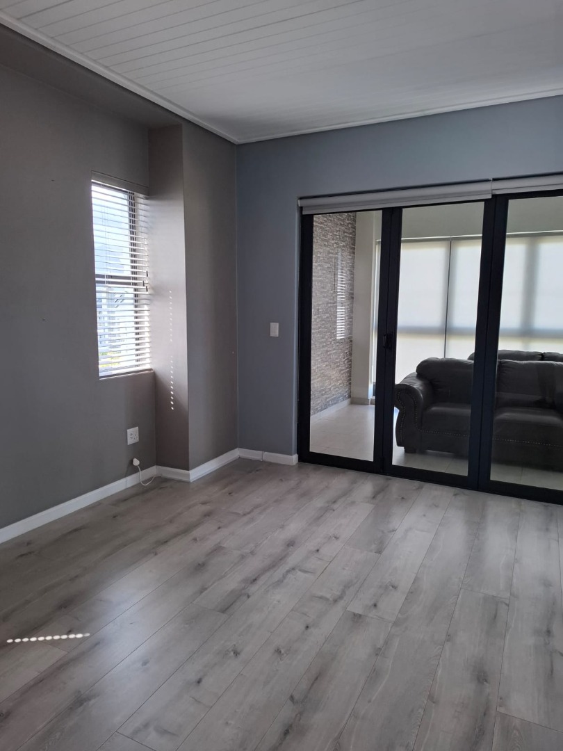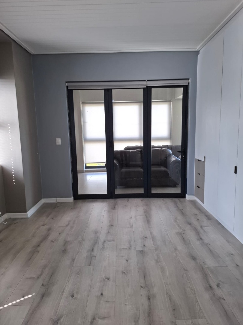 As you walk into this delightful,classy and spacious top floor apartment, you will find on your right hand side a slick, modern contemporary kitchen that offers ample cupboard space, engineered stone counter-tops and a built-in oven, extractor, hob, microwave and fridge/freezer. There is provision for a washing machine, tumbledrier and dishwasher. On top of it all, a generous kitchen island to enjoy breakfasts. There is more than enough space to house a dining room table seating 8 - 10 people, a spacious lounge and family room with a built in braai for entertaining or for the cold winter nights overlooking the estate.