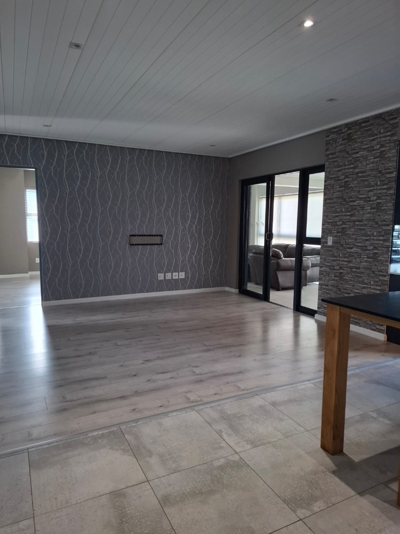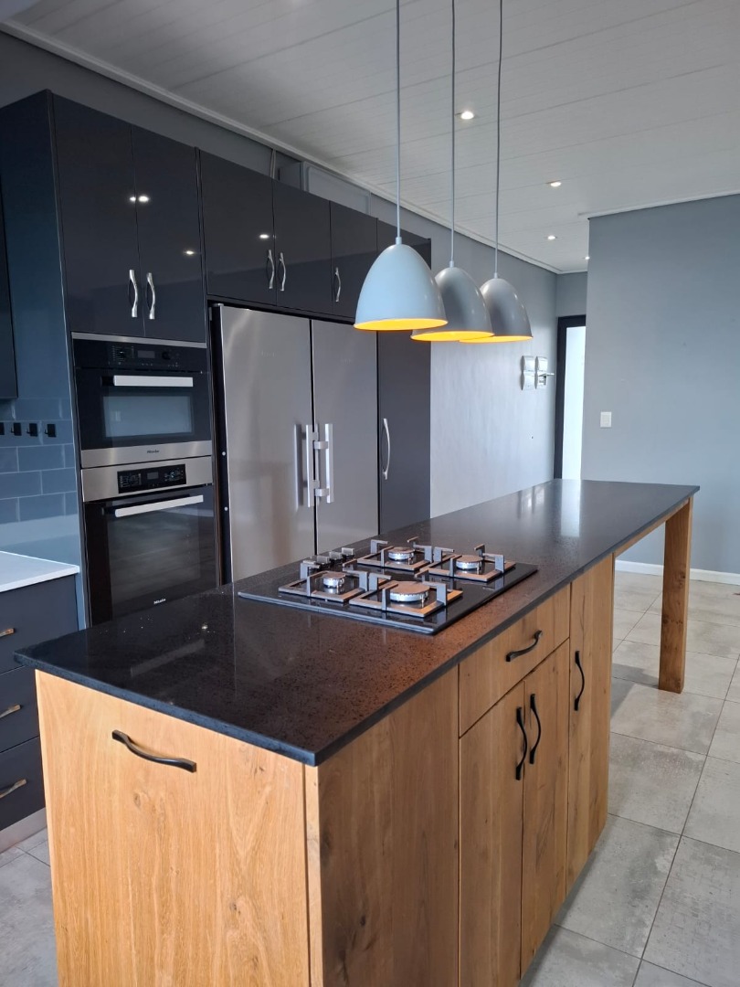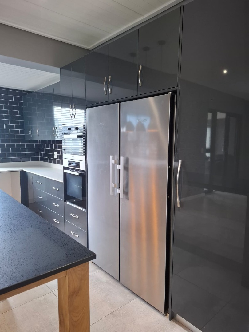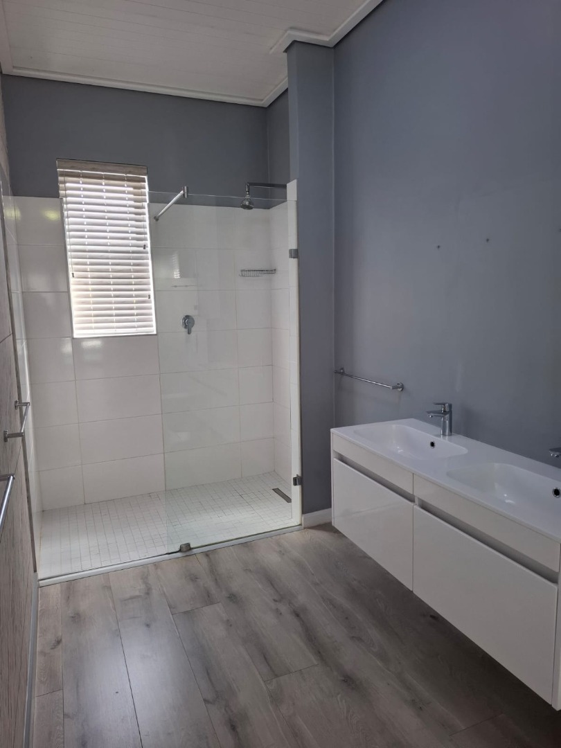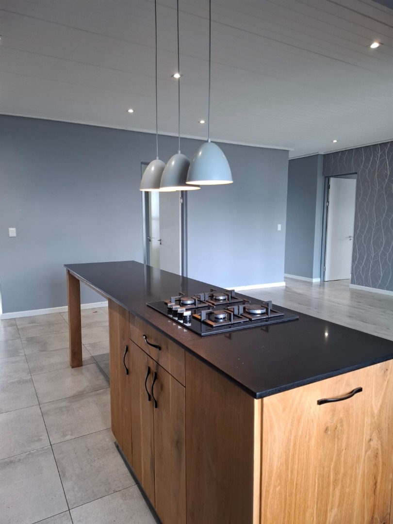 As you walk into this delightful,classy and spacious top floor apartment, you will find on your right hand side a slick, modern contemporary kitchen that offers ample cupboard space, engineered stone counter-tops and a built-in oven, extractor, hob, microwave and fridge/freezer. There is provision for a washing machine, tumbledrier and dishwasher. On top of it all, a generous kitchen island to enjoy breakfasts. There is more than enough space to house a dining room table seating 8 - 10 people, a spacious lounge and family room with a built in braai for entertaining or for the cold winter nights overlooking the estate.