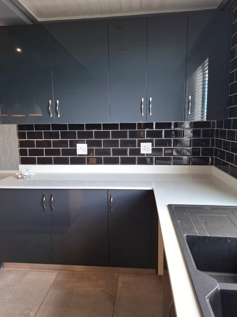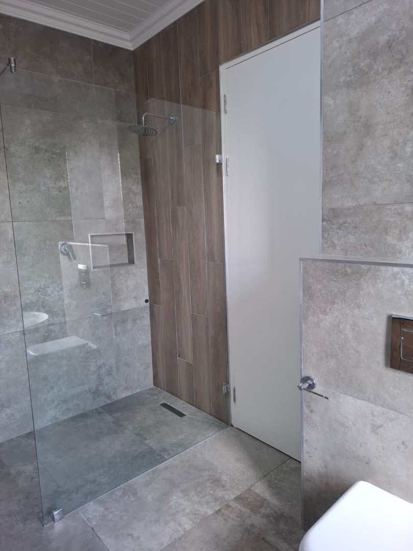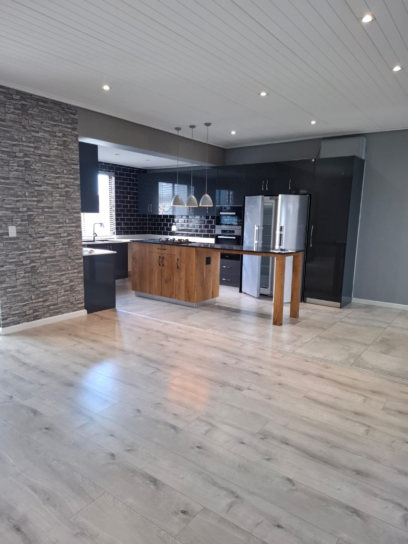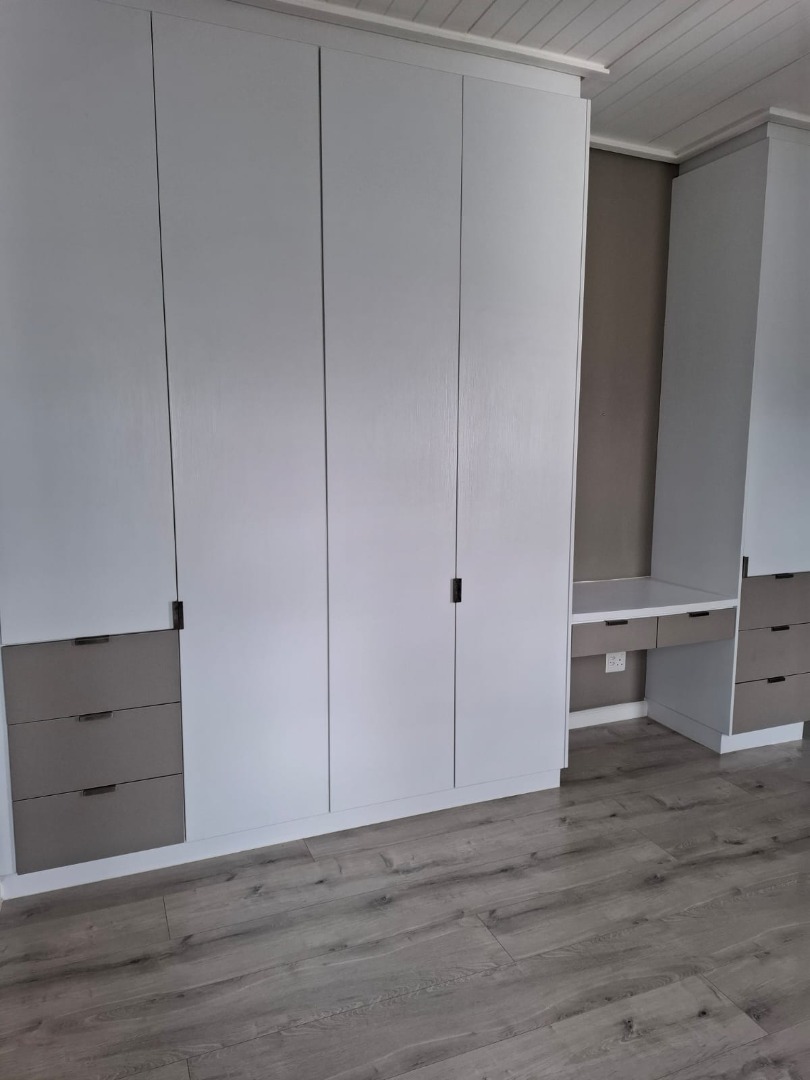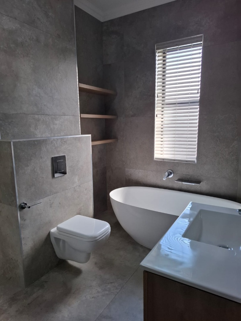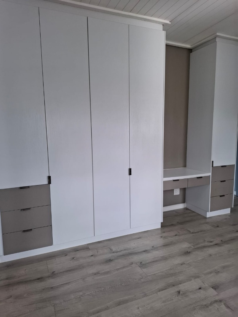 As you walk into this delightful,classy and spacious top floor apartment, you will find on your right hand side a slick, modern contemporary kitchen that offers ample cupboard space, engineered stone counter-tops and a built-in oven, extractor, hob, microwave and fridge/freezer. There is provision for a washing machine, tumbledrier and dishwasher. On top of it all, a generous kitchen island to enjoy breakfasts. There is more than enough space to house a dining room table seating 8 - 10 people, a spacious lounge and family room with a built in braai for entertaining or for the cold winter nights overlooking the estate.