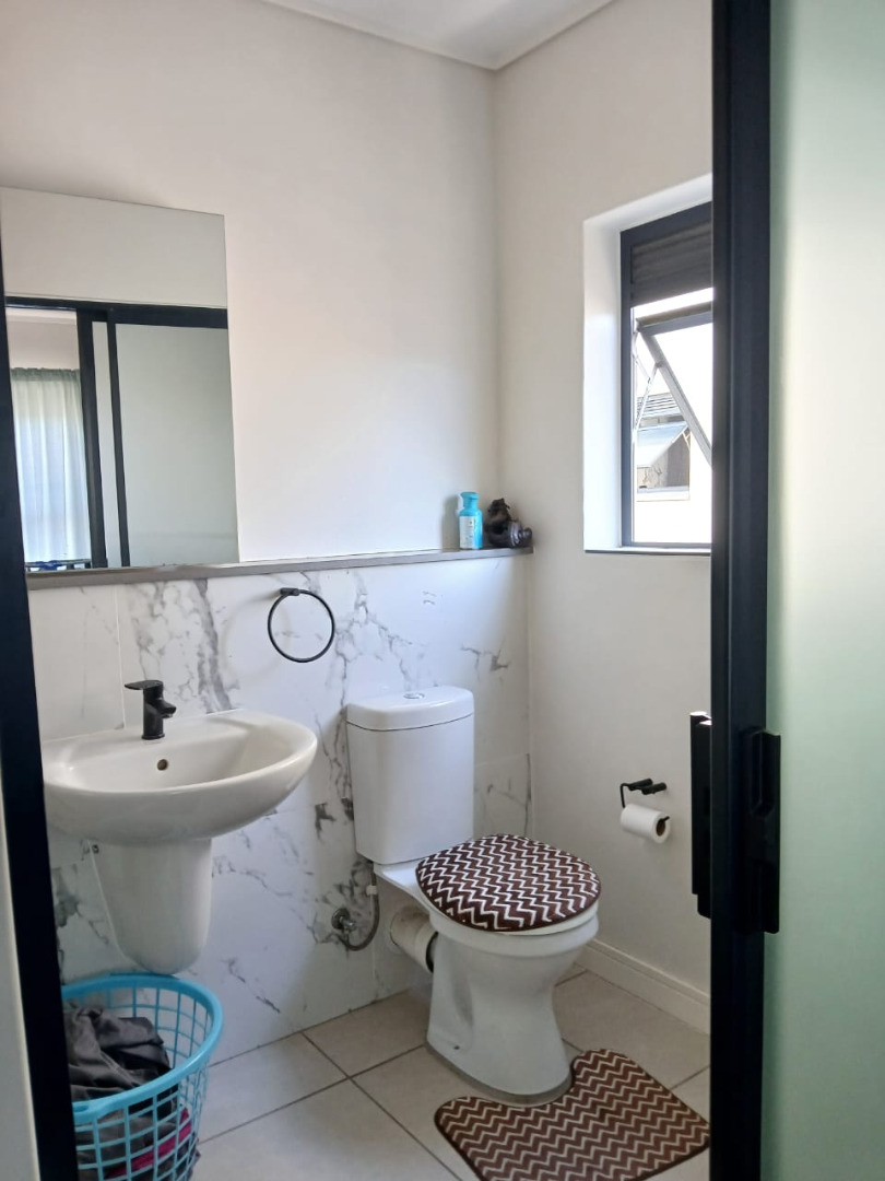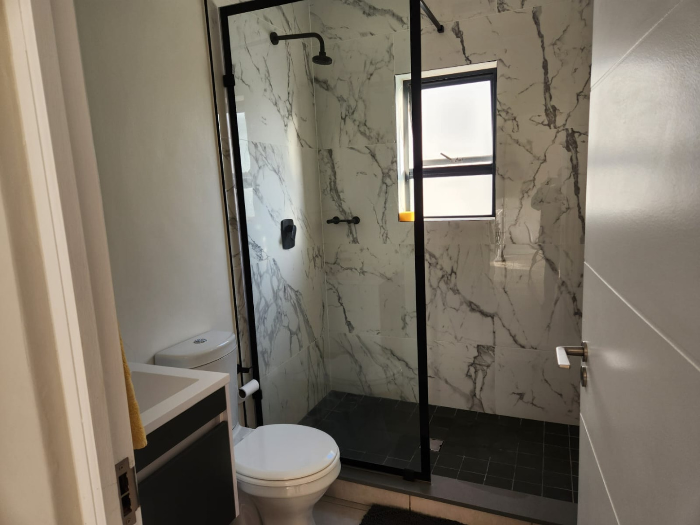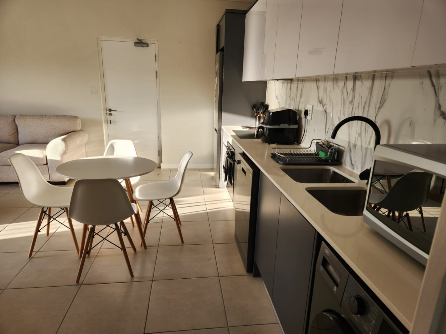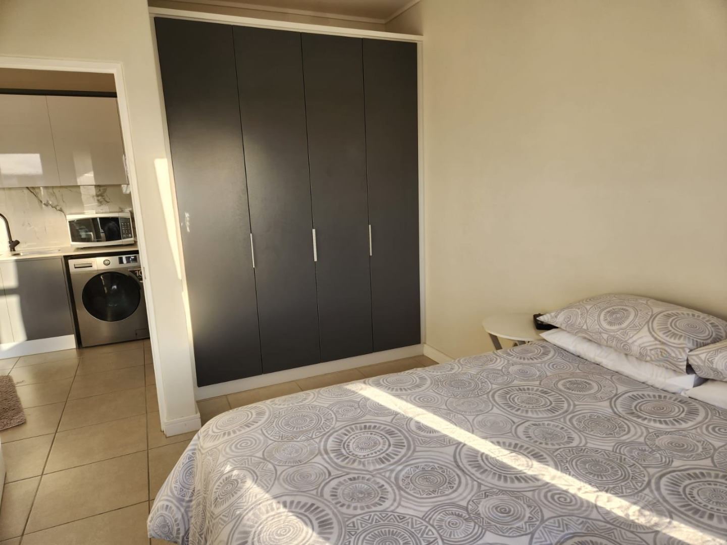 The bedroom offers sleek built-in cupboards and an adjoining private bathroom for added comfort. Both the bedroom and lounge open onto a generous patio, providing an inviting outdoor extension of the living space—perfect for relaxing or entertaining.