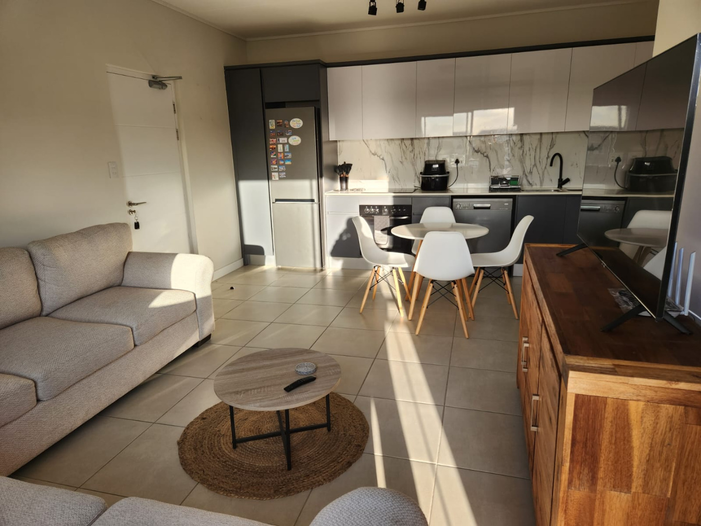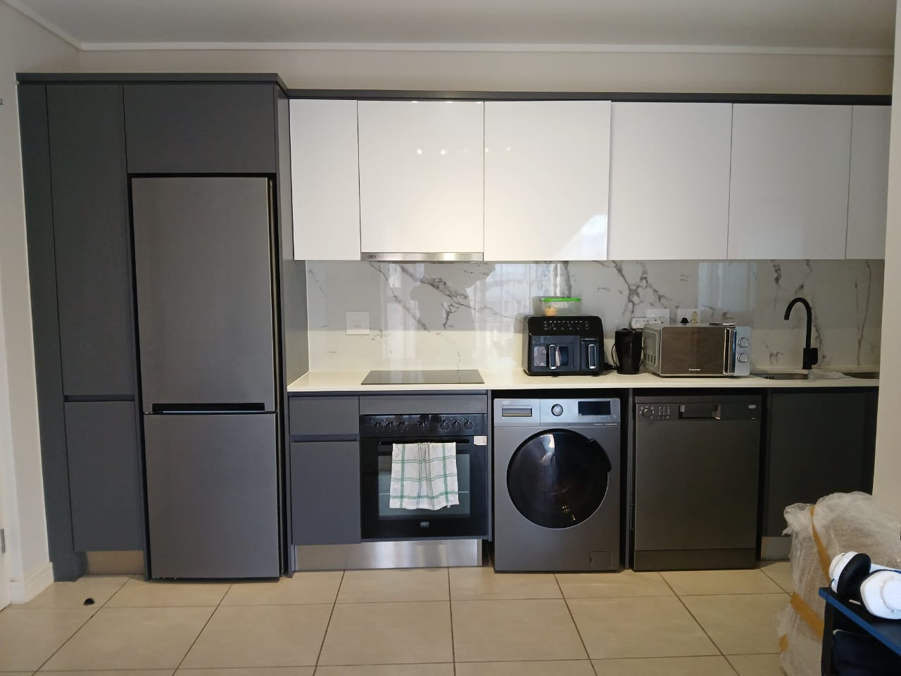 This apartment features an open-plan layout that creates a spacious, contemporary feel by seamlessly connecting the living and kitchen areas. The modern kitchen comes fully equipped with quality appliances, including a stove, hob, oven, fridge, and a washing machine.