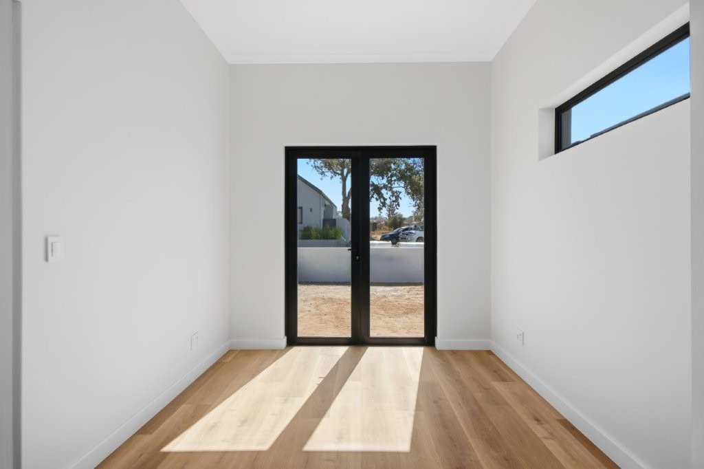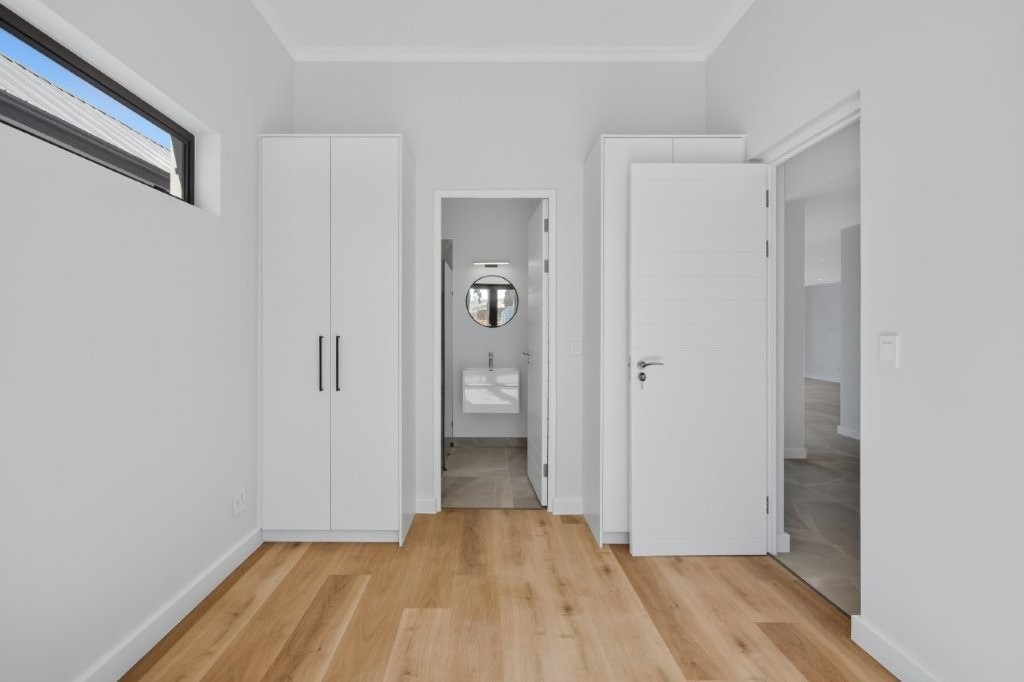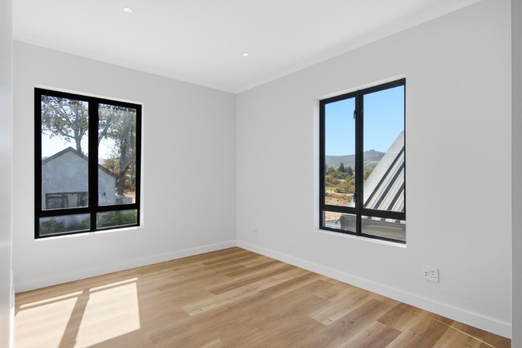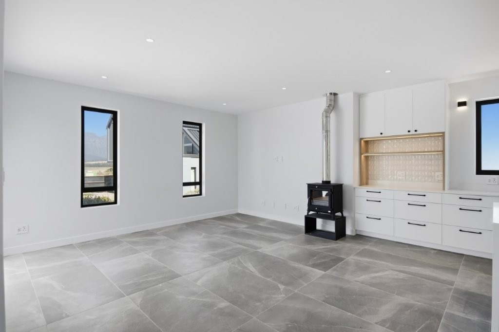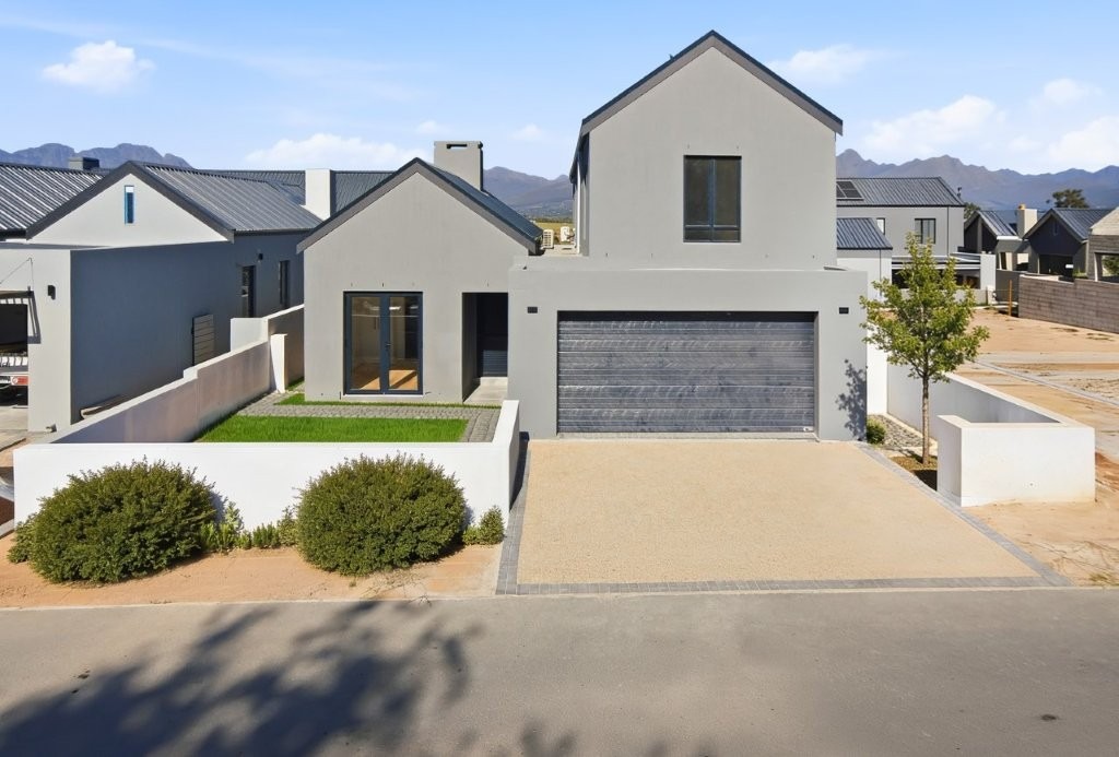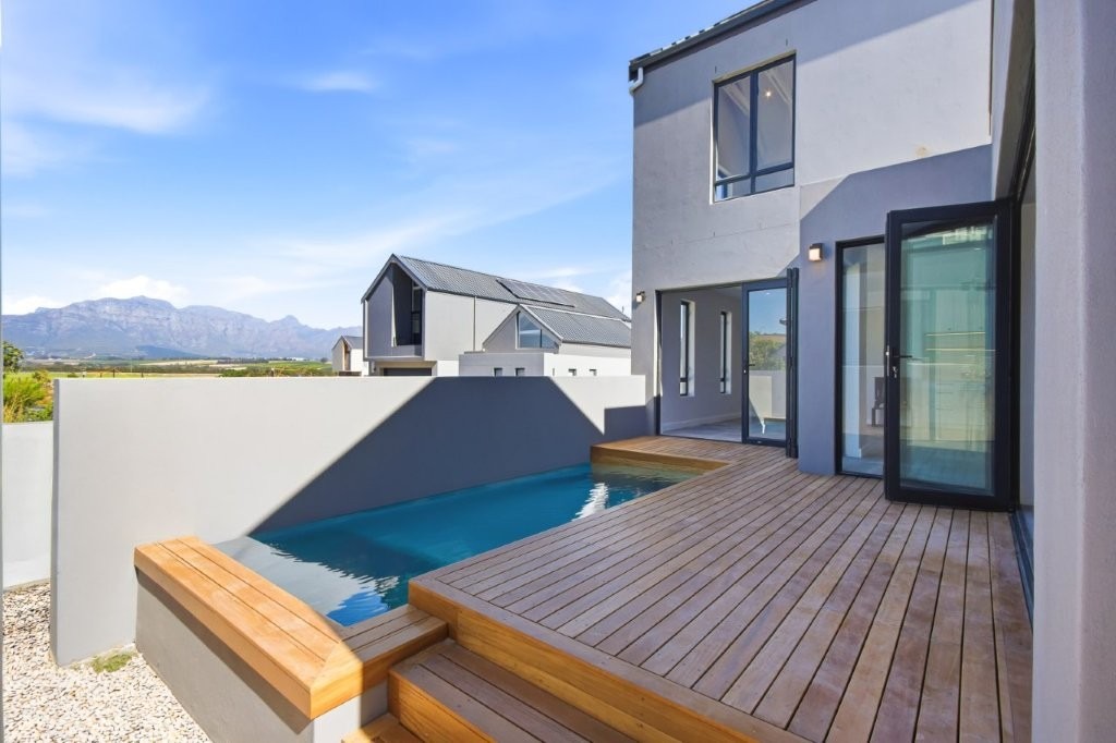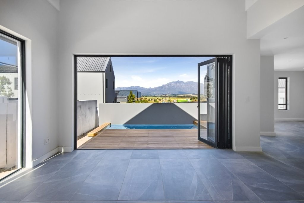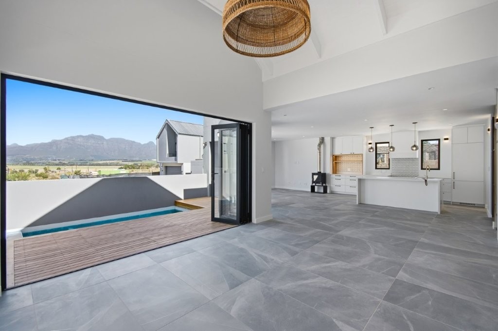 This newly built modern family home features 4 bedrooms with en suites, and spacious entertainment areas with beautiful views of the Stellenbosch Mountains.