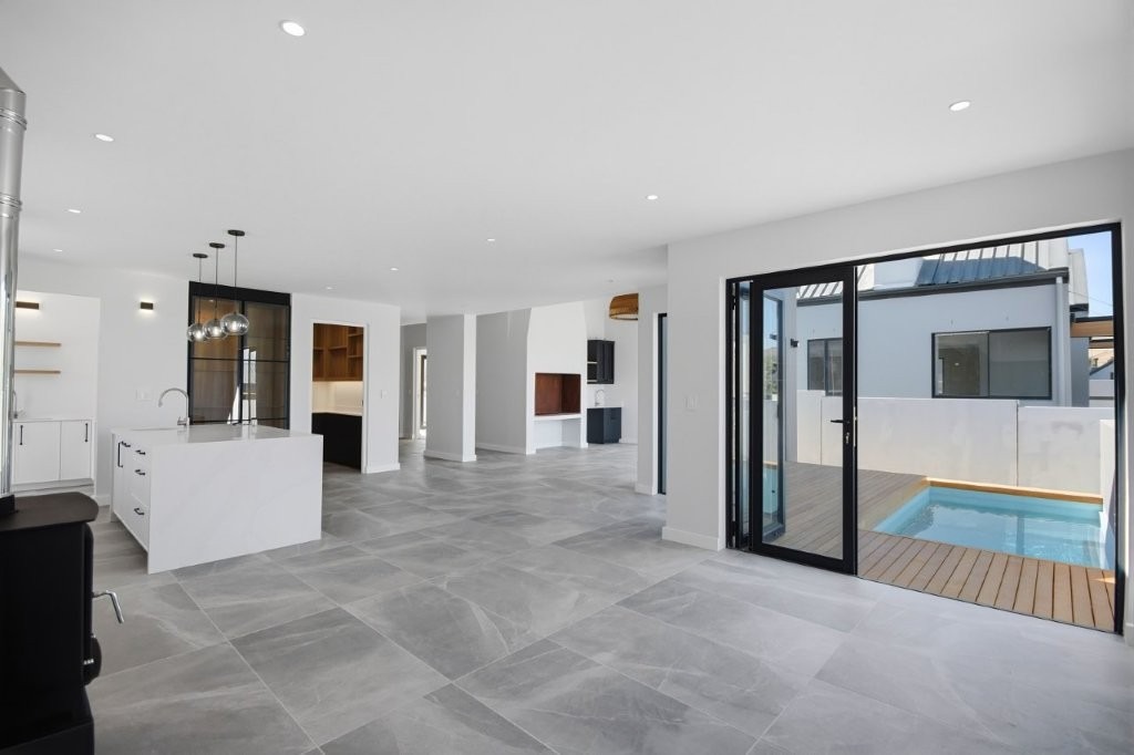 • Open-plan lounge and dining area with stacking doors opening onto the wooden deck and splash pool