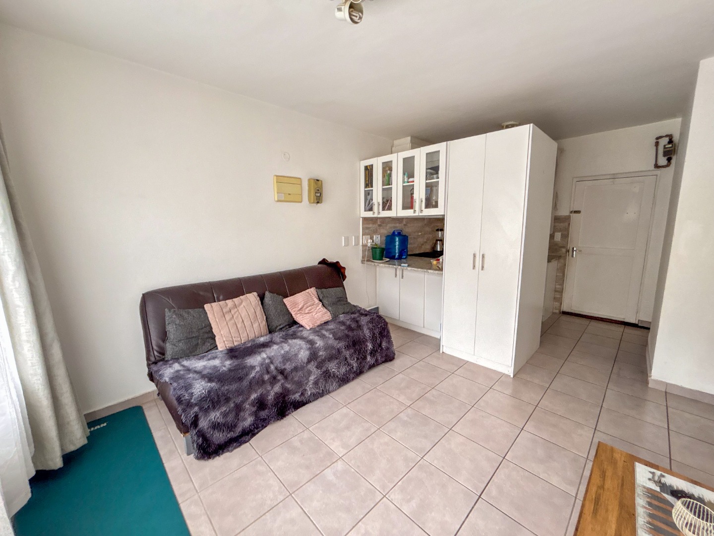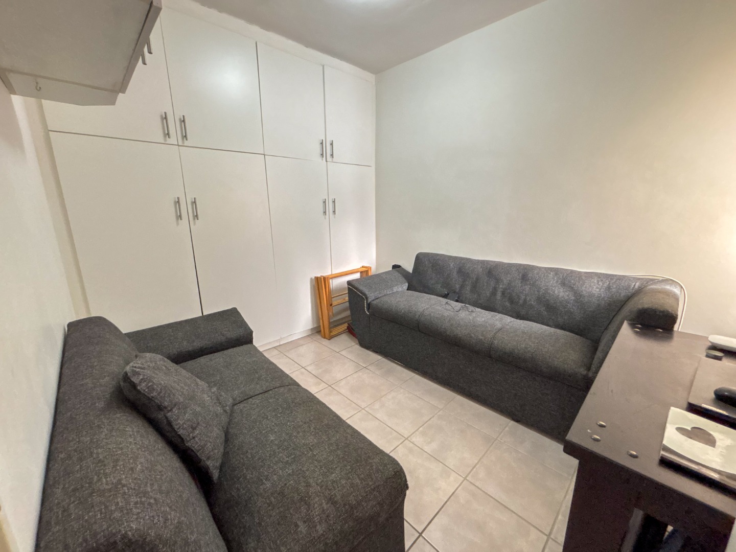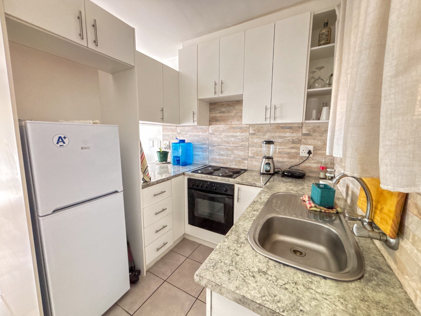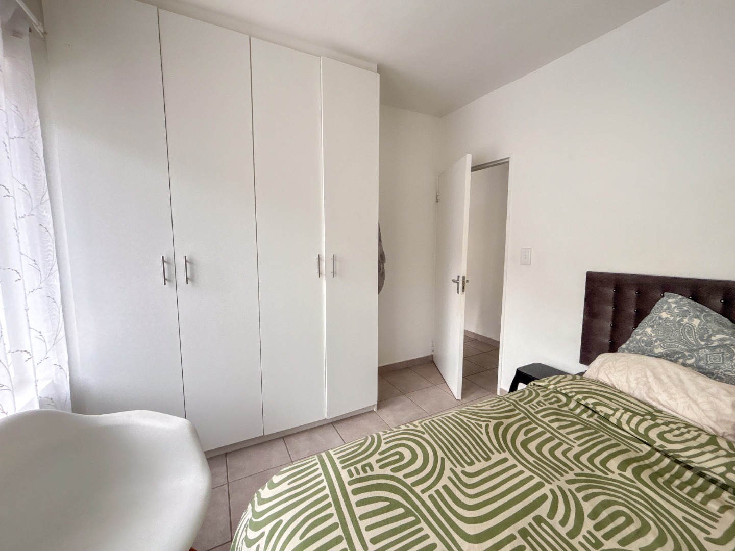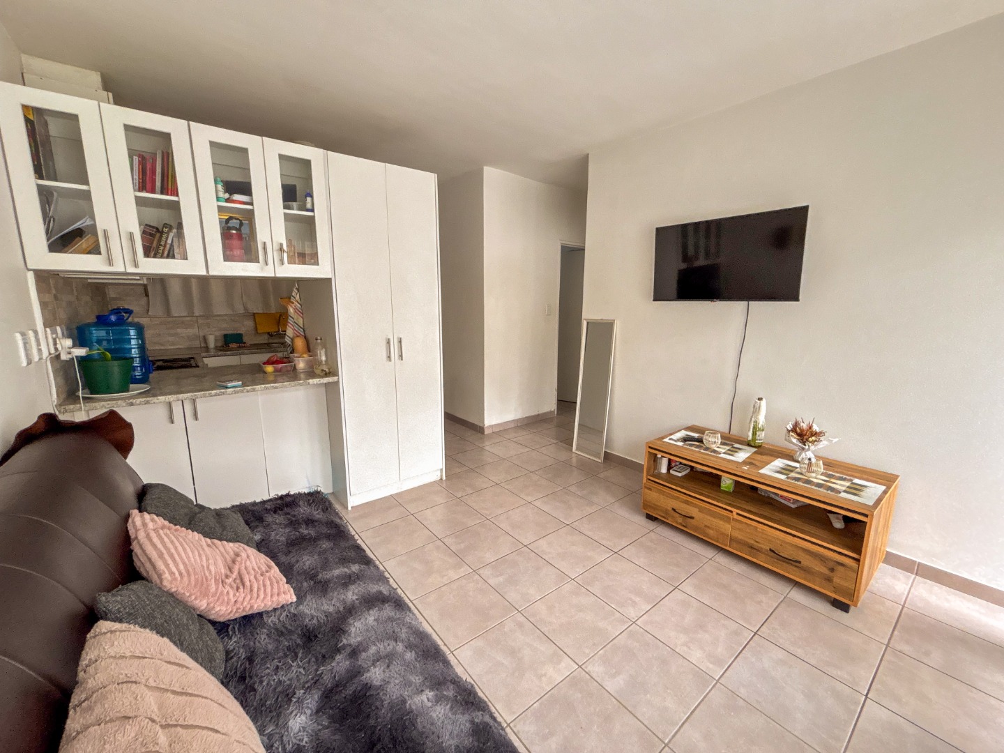 The property features two bright and airy bedrooms, each fitted with built-in cupboards, providing ample storage space. A neat bathroom includes a shower over the bath and conveniently houses a water point for a washing machine.